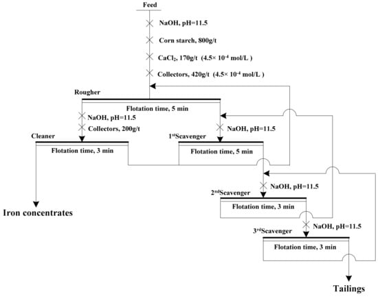 Based on the excellent flotation results of micro-flotation tests, bench-scale flotation tests were performed with industrial iron ores to further investigate the flotation performance of UFA and SFA. The flowsheet of bench-scale flotation tests was shown in Figure 3 and flotation results were presented in Table 4.