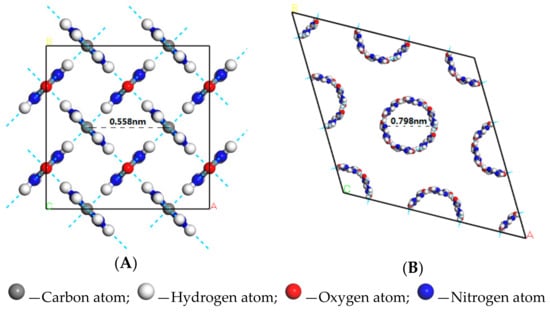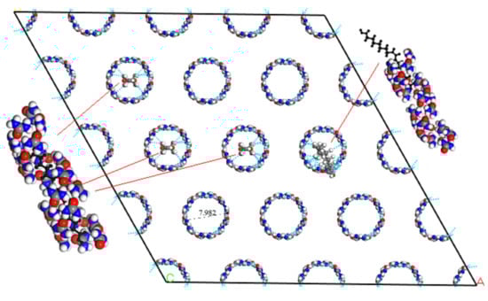 When the urea and fatty acids to form a urea inclusion compound, the crystal structure of urea was converted from the tetrahedron into hexahedron with a space group of P6122 [26,28]. Urea molecules were in a spiral way to form the host frame structure. The tunnels of this urea host structure could be filled with a dense packing of fatty acids as guest molecules. The results of molecular simulation showed that the diameter of the tunnels in the hexahedral host framework was 0.798 nm. Considering the intermolecular bonding distance, the molecule diameter of the guest fatty acids was 0.35~0.50 nm. The hexagonal crystal structure of urea was shown in Figure 4B.