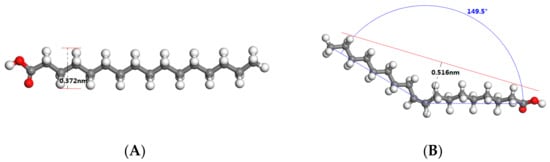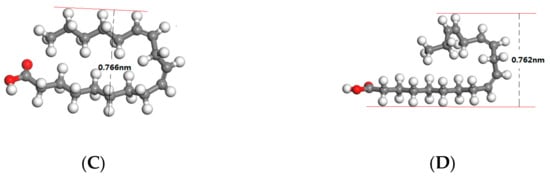 Quantum mechanics calculations were carried out by Cambridge serial total energy package (CASTEP) based on DFT to optimize the molecular structure of palmitic acid, oleic acid, linoleic acid and linolenic acid in waste cooking oil. The optimized molecular structure of those fatty acids was shown in Figure 5A–D. The calculated molecular width and molecular bending angle were shown in Table 2.