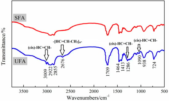 As shown in the infrared spectrum of UFA (Figure 7), the characteristic peaks at positions of 2922, 2855 and 1464 cm−1 assigned to asymmetric stretching of –CH3 group, symmetric stretching and scissoring of –CH2 group [30,36]. The characteristic sharp band at 1709 cm−1 was due to the asymmetric stretching of –C=O in the carboxyl group [37]. The absorption peak at 724 cm−1 belonged to C–H bending vibration of the methylene chain –(CH2)n–. The positions of 3009, 1286 and 1090 cm−1 come from the typical C–H stretching vibration, outward and inner bending vibration of the (cis) –HC=CH– group [38], respectively. The peak at 2676 cm−1 was the vibration absorption peak of –CH2 in –[HC=CH–CH2]n– (n > 1) group which was a cumulative carbon–carbon double bond structure [36]. It was indicated that UFA had not only single but cumulative carbon–carbon double bonds, resulting in a higher degree of dissatisfaction. However, the characteristic peaks at positions near 3009, 1286, 1090 and 2676 cm−1, which were assigned to carbon–carbon double bonds and cumulative carbon–carbon double bonds, did not appear in the spectrum of SFA. Therefore, it was proved that in SFA there was no obvious single or cumulative carbon–carbon double bonds. In other words, SFA should be composed of saturated fatty acids.