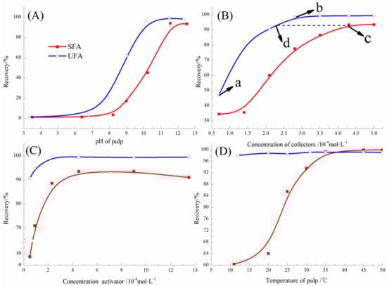 Recovery of quartz as a function of pulp pH (A), collector concentration (B), activator CaCl2 concentration (C) and pulp temperature (D) with UFA or SFA.
