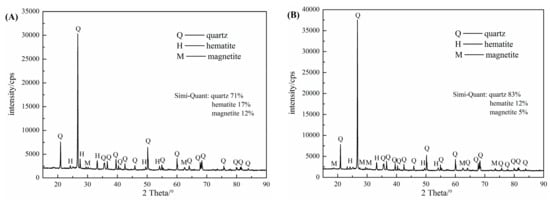 X-ray diffraction of flotation tailings with collector SFA (A) or collector UFA (B).