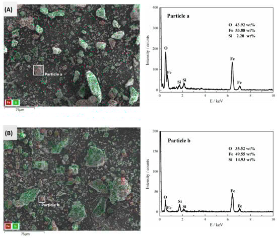 SEM photomicrographs with EDS: (A) flotation tailings with collector SFA; (B) flotation tailings with collector UFA.