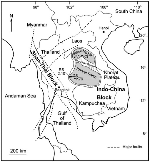 Geological map of Southeast Asia showing the Khorat Plateau, the Khorat Basin (cores RS2.10, RS2.6, and K79) and the Sakon Nakhon Basin (cores K1 and K3), major faults, and tectonic blocks (modified from El Tabakh et al. [24]).