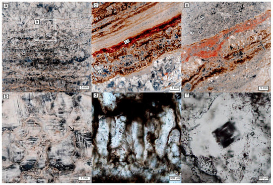 Microcrystalline hematite occurs in primary halite and carnallite of the Maha Sarakham Formation (Figure 6a,b). X-ray diffraction and SEM analysis on insoluble residues from red crystals of halite confirm that these crystals are hematite. Aeolian atmospheric aerosols can load Fe-rich particles to the open ocean via long range transport [45]. Hematite crystals observed in primary halite and carnallite of the Maha Sarakham Formation, however, are not dust particles because they occur as oriented hexagonal plates parallel to halite crystal growth faces (Figure 6). This indicates co-precipitation of iron oxide with halite or carnallite at brine temperatures >60 °C and possibly as high as 100 °C rather than oxidation of ferrous iron from solid solution during diagenesis [39,40,42,43]. In addition, hematite crystals derived from iron oxide dust would occur as randomly oriented particles incorporated within halite or carnallite or at their crystal boundaries, which is not observed. However, during halite and carnallite precipitation, soluble Fe2+ in shallow marine brines can be oxidized to Fe2O3 at low temperatures, leading to co-precipitation of hematite and halite or carnallite.