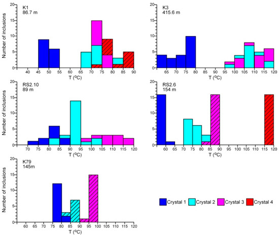 Daughter crystals from the Maha Sarakham Formation halites had relatively high dissolution temperatures, similar to those reported from previous studies (Table 2). Dissolution temperatures of daughter crystals measured in 277 primary fluid inclusions from 17 individual halite fragments range from 45.7 °C to 119.5 °C with an average of 85.6 °C (Figure 5). Dissolution temperatures measured from one chevron halite crystal at 145 m, core K79, for example, show a narrow range of 83.8–87.1 °C (average of 85.4 °C), whereas one cumulate halite from 415.6 m, core K3 has the widest range of 95.2–119.5 °C, (average of 107.4 °C) (Table 2). Dissolution temperatures are reproducible between 0.1 °C and 10.2 °C (average of 1.8 °C) (Table 2). These results indicate that cumulates and chevrons crystallized at variable temperatures in warm brines.