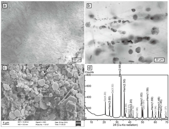 Photomicrographs and X-ray diffraction (XRD) analysis of hematite crystals from core RS2.6, 154 m. (a) Microcrystalline hematite incorporated within halite; (b) hematite crystals are 1–10 µm hexagonal plates; (c) scanning electron microscopy (SEM) image of the hematite crystals. All the hexagonal plates are hematite; crystals with trigonal pattern (arrow) are quartz; (d) XRD result of insoluble residue following dissolution of halite in water. Numbers in the parentheses are d-spacings in Å of Qz: quartz and Hem: hematite.