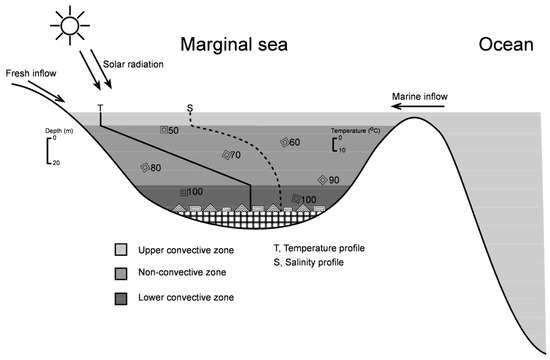 The salinity gradient, i.e., density stratification, plays a critical role in heating and solar energy storage in meromictic lakes or solar ponds. Generally, an ideal salinity gradient is composed of three layers from top to bottom: the upper convective zone (UCZ), the non-convective zone (NCZ), and the lower convective or storage zone (LCZ) (Figure 7). The UCZ is the topmost homogeneous layer of low-salinity brine or fresh water. Below the UCZ, the NCZ has higher salinity and temperature than the UCZ; the NCZ provides insulation for the LCZ, which is the bottom layer with greatest salt concentration, saturated with respect to halite or other evaporites [60]. Convective currents in the NCZ are suppressed by increasing the density gradient downwards when water is heated from the bottom by absorbed solar radiation. If the concentration gradient is great enough, no convection occurs in this region and the energy absorbed in the bottom of the pond is stored in the LCZ [60]. This salinity-density structure may occur in waters with variable depths, but preferably <10 m because solar radiation is needed to penetrate the water column and heat the bottom. Typical solar-heated lake depths are 1.32 m in Medve Lake [53], 2 m in Hot Lake [54], 3.25 m in El Paso Solar Pond [62], and 7.5 m in Great Salt Lake [58].
