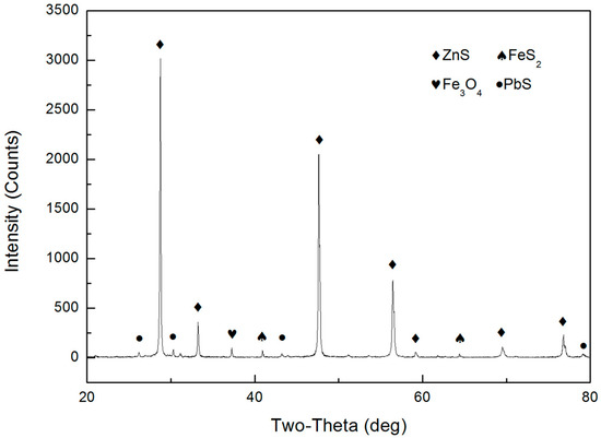 In the present study the zinc sulfide concentrate was obtained from Huize County of Yunnan province in China. The main chemical composition of the zinc sulfide concentrate is shown in Table 1, it can be seen that the zinc sulfide concentrate is mainly comprised by zinc, sulfide, ferrum and plumbum, zinc and sulfide make up about 84.14 percent mass fraction of the zinc sulfide concentrate. The zinc phase distribution in the zinc sulfide concentrate is presented in Table 2, it can be seen that zinc exists in the state of zinc sulfide, zinc carbonate, zinc silicate, and franklinite et al., zinc sulfide has a primary value of 49.50 percent mass fraction in the 51.16 percent total zinc. XRD was also used to analyze the component phases, and the results are shown in Figure 1, it also can be found that zinc sulfide is the dominating composition of the zinc sulfide concentrate.