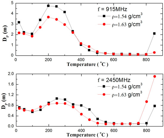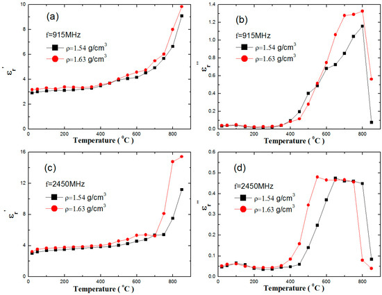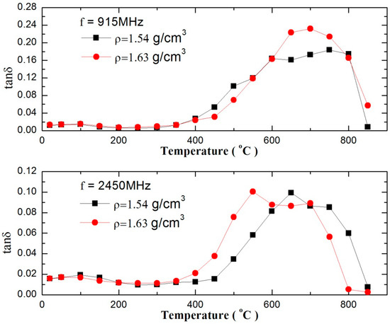 The dielectric loss factor at 915 MHz from Figure 3b is smaller than that at 2450 MHz from Figure 3d when the temperature under 400 °C, but reverse results when the temperature above 400 °C. It can be concluded that dipolar rotation is the main contribution to the loss factor when temperature under 400 °C, while ionic conduction contributes mainly to the loss factor when temperature above 400 °C because thermal agitation disturbs the alignment of the molecule dipole with the electric field and conduction increases as the temperature increases, similar results have also been reported by some literature [22,23]. In addition, the dielectric loss factor of apparent density of 1.63 g/cm3 is mostly larger than that of 1.54 g/cm3 for the same temperature. Hence, the temperature, frequency and apparent density have a great effect on the dielectric loss factor.
