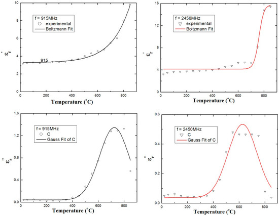 Experimental values of dielectric properties fitted with Boltzmann model and Gauss model for apparent density 1.63 g/cm3 at 915 MHz and 2450 MHz.