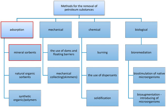 A number of mechanical, biological, chemical and adsorption methods are currently used to remove oil spills from water media and paved roads, and to remove volatile hydrocarbons (Figure 1) [7,8,9,10,11,12,13,14].