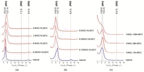 Fragments of the X-ray diffraction patterns of natural and treated montmorillonites: (а) Mt-M; (b,c) Mt-T. Abbreviations: 3.0 HCl, 1 HNO3, type and concentration (given in mol/L) of acid; 7 d (days), 12 h (hours), time of treatment, 20, 90 °C, temperature of treatment.