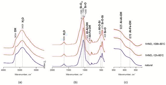Leaching of the octahedral cations leads to modifications of the interaction between the octahedral and tetrahedral sheets in the 2:1 layer and, as a result, to the partial destruction of octahedral sheets. Alterations in FTIR data revealed as decreasing intensities of the bands related to octahedral Al, Fe and Mg and exchangeable Ca, Na and Mg correlate with changes in chemical composition shown above. Therefore, the structural units comprised of the tetrahedral sheet fragments are released from the 2:1 structure, which corresponds to “Si–Ofree” vibrations—1095 cm−1 [11,15,21,50]. Changes in the Si–O–Si band profile within the range of 1100–1050 cm−1 (Figure 2b) indicate transformation of interaction within the tetrahedral sheet. In particular, displacement of the maximum in the natural sample from 1050 to 1095 cm−1 after treating it with 1 M HNO3 for 108 h indicates the increase of amorphous silica content due to partial destruction of the tetrahedral sheet which is confirmed by chemical analysis data as an increase in Si content in powder samples.