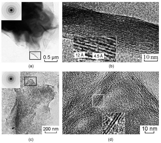 Studied samples of the natural montmorillonites are characterized by peculiar particle morphology that is typical for montmorillonites of different genesis and by a wide spread of welted edges, which can be useful for obtaining pictures of the lattices (Figure 4). Images obtained from edges of natural montmorillonite (Mt-T2 sample) show the lattice stripes that correspond to the basal planes (Figure 4a,b). The width of the areas with lattice stripes is about 23–32 nm. The value of the interlayer space for different particles varies within the range from 10.5 to 11.8–12.3 Å.