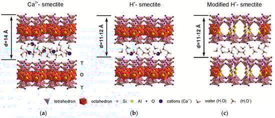 Studied montmorillonite samples are characterized by the heterogeneous composition of the interlayer: Ca2+ and Mg2+ for the Mt-M sample (d001 = 15.3 Å), and Ca2+, Mg2+and Na+ (d001 = 13.7 Å and d001 = 13.9 Å, respectively) for Mt-T1 and Mt-T2 samples (Figure 1, Table 1). Presence of Na+ in the montmorillonites from the Taganskoye deposit was also confirmed in previous studies [26,42,43].