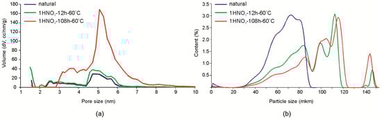 Mesopores of a size about 5 nm and a small amount of micro-pores with a diameter of about 3 nm are predominant in the natural montmorillonite. After treatment with hydrochloric acid with concentration up to a 3.0 M at room temperature for 7 days, significant changes in the structure of the pore space were not observed, which also can be seen below in the N2 adsorption-desorption isotherms. Treatment with 1 M HNO3 for 12 h does not lead to significant changes of the pore space either. The most significant changes were observed as a result of treatment for 108 h (Figure 6a): the amount of 5–5.5 nm mesopores significantly increases and micropores with an average diameter of 3.5 nm appear which is not observed in natural montmorillonite samples. The particle size distribution changes even at low exposure times in the experiment with 1 M HNO3 (Figure 6b) from monomodal shape with a maximum at 50 µm to a multimodal shape with peaks at ~80, 100, 145, and 200 µm. Thus, with increased micro- and mesoporosity, particle aggregation occurs that leads to the formation of relatively large aggregates of different sizes.