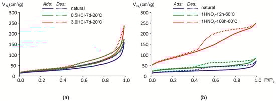 Hysteresis loops may have a different shape and, in the study of natural montmorillonite, can be attributed to the H3-H4 type [61]. Loops of this type correspond to the interaction between nonrigid lamellar particles. Smooth slope loops correspond to filling the micro- and mesopores. Increase in steepness after the acid treatment may be explained by an increase of the pore volume and the appearance of macro-porosity. The specific hysteresis loop of the sample Mt-T2 isotherm after prolonged exposure to 1 M HNO3 (Figure 7b) can be attributed to the type H2(b) [61]. This type of a desorption branch of the isotherm can be the result of a complex system of channel and pore formations and a partial blocking of them.