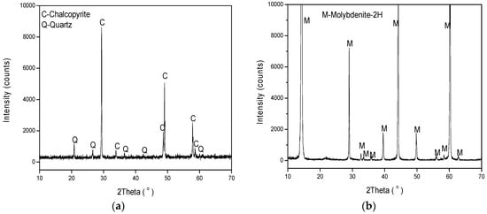 X-ray diffraction (XRD) analyses of pure minerals, (a) chalcopyrite and (b) molybdenite.