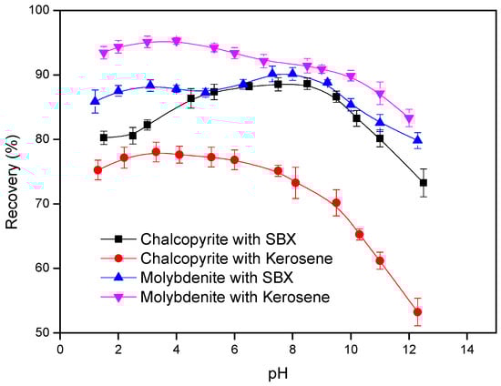 Flotation recoveries of chalcopyrite and molybdenite as a function of pH by adding sodium butyl xanthate (SBX) (100 g/t) or kerosene (40 g/t) and opening to the atmosphere.
