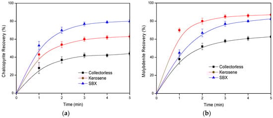 Flotation recoveries of (a) chalcopyrite and (b) molybdenite at pH = 11 as a function of flotation time open to atmosphere with a collector: SBX (100 g/t), kerosene (40 g/t), or collectorless.