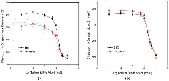 (a) The flotation recovery of chalcopyrite at pH = 11 as a function of added sodium sulfide with 100 g/t SBX or 40 g/t kerosene added in 5 × 10−3 mol/L NaCl; (b) The Eh of the system under the same conditions.