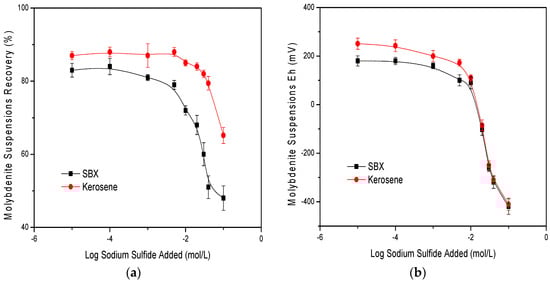 (a). The flotation recovery of molybdenite at pH = 11 as a function of added sodium sulfide with 100 g/t SBX or 40 g/t kerosene added in 5 × 10−3 mol/L NaCl; (b) The Eh of the system under the same conditions.