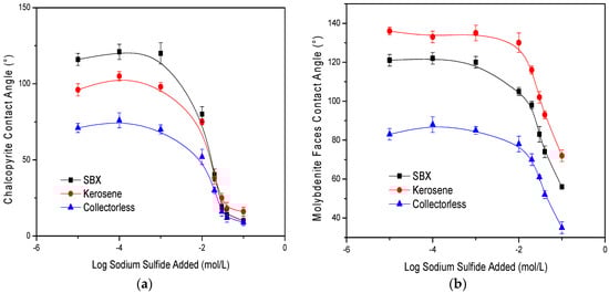 (a) The contact angles of chalcopyrite and (b) molybdenite faces at pH = 11 as a function of added sodium sulfide with 100 g/t SBX, 40 g/t kerosene or collectorless.