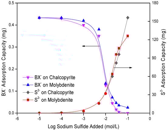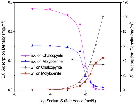 Figure 8 exhibits the adsorption capacities of BX− and S2− on chalcopyrite and molybdenite surfaces treated with different dosages of sodium sulfide. The left axle belongs to the butyl xanthate ion adsorption capacity, which showed that BX− ions completely adsorbed on molybdenite and chalcopyrite surfaces at 10−5 mol/L sulfide, i.e., almost no BX− ions were detected in the residual solution. After that, the BX− on chalcopyrite dropped faster than on molybdenite with the sulfide concentration increase. Finally, BX− still remained in small amounts on molybdenite but disappeared on chalcopyrite. These performances prove that high sodium sulfide concentration could seriously destroy the adsorption of xanthate on sulfide minerals, especially on chalcopyrite. The complete desorption on chalcopyrite at 0.1 mol/L sulfide agrees with the contact angle results in Figure 7a. Thus, the incomplete desorption on molybdenite may be due to the larger specific surface area, the better inherent floatability, or the unique layered structure. BET measurements showed that molybdenite samples were about twice the surface area of chalcopyrite samples, which suggested that molybdenite had stronger adsorbability, according to the concept of higher adsorption capacities occurring on larger surface areas [44]. The better inherent floatability of molybdenite predicts that it would be more attractive to the non-polar group of chemicals [45]. The unique layered structure of molybdenite may allow the collector or its branch to diffuse as molybdenite is a layered modified material [46]. The sulfide (hydrosulfide) ion adsorption capacity marked in the right axle showed that sulfide completely adsorbed on chalcopyrite and molybdenite and obtained the same absorption capacities when the sulfide concentration was less than 0.01 mol/L. Then molybdenite had a little more sulfide coating than chalcopyrite in the sulfide concentration range from 0.01 to 0.04 mol/L, while having fewer sulfide coverages than chalcopyrite when the sulfide was added to 0.1 mol/L. It seems that sulfide (hydrosulfdie) does not tend to adsorb on molybdenite in high sulfide concentrations. The BX− and S2− adsorption densities are also calculated and presented in Figure 9. The density of butyl xanthate adsorbed on molybdenite is much less than that of chalcopyrite in a sulfide dosage lower than 0.02 mol/L. In contrast, with the sulfide dosage continuously increasing, the BX− adsorption density on molybdenite was shown to be a little higher than that of chalcopyrite, which clearly explained the flotation responses of chalcopyrite and molybdenite with SBX in the high sulfide concentration, in which molybdenite retains its floatability. Different from the BX− adsorption density, the S2− density adsorbed on chalcopyrite was always higher than on the molybdenite in the same concentrations, and the gap between these two adsorption densities became greater as the sulfide dosage increased. It also indicated less depression of sodium sulfide on molybdenite.