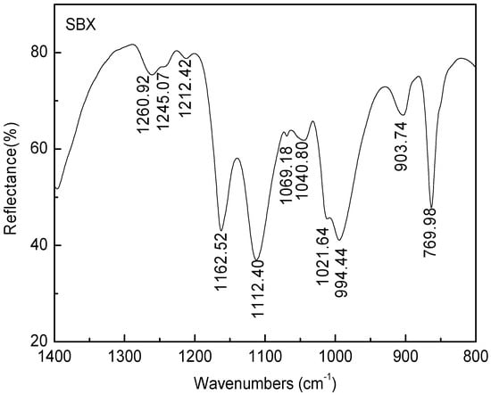 Figure 10 demonstrates the FTIR spectrum of sodium butyl xanthate, which is industrial grade. The spectrum is enlarged to reveal the details of the characteristic peaks of xanthate in the range of 1400–800 cm−1. According to the literatures [47,48], the spectral peak at 1069.18 cm−1 assigns to the C=S stretching vibration of SBX. The intense peak at 1112.40 cm−1 symbolizes to the C–O–C symmetric stretching vibration, and that at 1162.52 cm−1 refers to the C–O–C asymmetric stretching vibration of SBX. The peaks detected at 1021.64 and 1040 cm−1 are attributed to the C=S stretching vibration in (BX)2. The peak at 1212.42 cm−1 also assigns to the C–O–C symmetric stretching vibration, and the 1260.92 and 1245.07 cm−1 peaks correspond to C–O–C asymmetric stretching vibration in (BX)2. Evidently, the C=S vibration peak of (BX)2 shifted toward lower wavenumbers as the C–O–C vibrations moved toward higher wavenumbers, compared to those of SBX. It indicates that the SBX collector has been oxidized and contains (BX)2 [49]. Although the SBX was partly oxidized, it did not influence the adsorption measurement. In the chalcopyrite suspension, the copper ion could react with BX− in solution to form unstable Cu(BX)2, which in turn dissociated into CuBX and (BX)2, as shown in the following equation [31]: