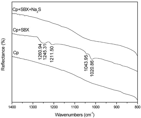 The FTIR spectrum of chalcopyrite before and after conditioning with SBX and Na2S is presented in Figure 11. No vibration peak was found in the FTIR spectrum of the unprocessed chalcopyrite sample. After conditioning with SBX for 5 min, five visible absorption peaks were detected on the chalcopyrite surface. The weak intensities of these peaks may be due to the less reagent dosage and limited reaction time. The C=S vibration peak of CuBX shifts toward lower wavenumbers, while the C–O–C vibration shifts toward higher wavenumbers, compared with those of butyl xanthate, due to the coordinated structure of CuBX [47]. It reveals that 1043.95 cm−1 is due to the C=S stretching of CuBX, which shifts from 1069.18 to 1043.95 cm−1. Also, the peak at 1211.50 cm−1 and the broad peak containing 1260.94 and 1245.31 cm−1 are attributed to the C–O–C symmetric and asymmetric stretching of (BX)2, respectively. The peak at 1020.86 cm−1 corresponds to the C=S stretching vibration in (BX)2. No obvious shift (less than 20 cm−1) occurring during the adsorption of (BX)2 indicates that (BX)2 physically adsorbs on the chalcopyrite surface [50]. After conditioning with Na2S for 5 min, all absorption peaks disappeared, indicating that sodium sulfide could decompose the products, CuBX and (BX)2, on the chalcopyrite surface. Two equations can be used to explain the mechanism.