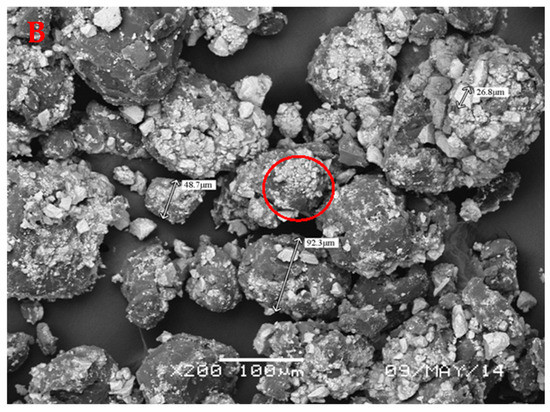 SEM images of the raw ore and carrier flotation concentrate are shown in Figure 1. Notable differences were observed before and after carrier flotation. The feed contained individual solid particles (Figure 1A). SEM images of the concentrate with polystyrene (Figure 1B) revealed that fine smithsonite particles floated around polystyrene, forming a shell. Because all smithsonite particles adhered to the surface of polystyrene, forming a shell and generating larger polystyrene–smithsonite aggregates, individual fine smithsonite particles were virtually absent in the concentrate. As expected, the recovery of smithsonite increased with the increasing size of aggregates due to increased probability of collision and adhesion between enlarged particle aggregates and bubbles.