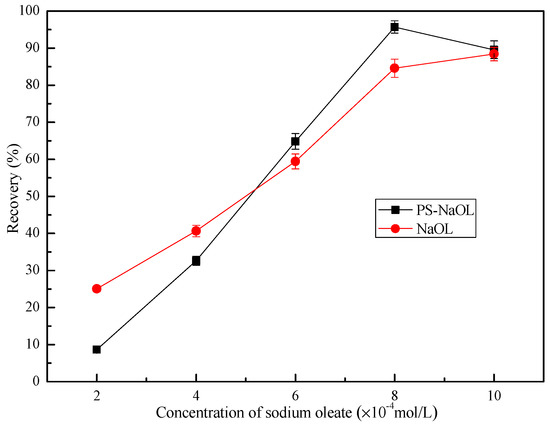 The adhesion of smithsonite to polystyrene was found to depend on the adsorption of collectors on mineral surfaces. Figure 2 shows smithsonite recovery as a function of sodium oleate concentration, with and without polystyrene. When using 70 kg/t polystyrene (dry ore), the smithsonite recovery increased as sodium oleate concentration increased. A maximum recovery (95.69%) was obtained with 8 × 10−4 mol/L sodium oleate. Without polystyrene, the smithsonite recovery increased as sodium oleate concentration increased up to 10 × 10−4 mol/L. The difference in flotation behavior, with and without polystyrene, might have been caused by the different adsorption densities of the sodium oleate on polystyrene and smithsonite. At a low oleate concentration (<5 × 10−4 mol/L), the adsorption density on smithsonite particles would be higher without polystyrene than that with polystyrene. Because some oleate could have been adsorbed on the polystyrene, the oleate concentration available in the pulp for smithsonite adsorption would decrease. At such a low concentration of sodium oleate, the hydrophobicity of smithsonite can be relatively low, resulting in a low smithsonite aggregation and recovery. The low hydrophobicity of smithsonite would also limit hydrophobic coagulation between smithsonite and polystyrene. As a result, a lower smithsonite recovery was observed with a polystyrene addition compared to that observed without such an addition.