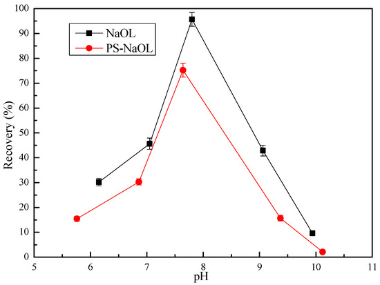 For a given flotation system, an optimal pH value exists for maximizing flotation recovery [32]. The pH could affect particle–bubble interaction [33], slurry characteristics, and charge of the species present in the pulp (ionization, dissociation, and dissolution). These effects influenced the hydration of the mineral surface and the reagent properties, which consequently interfered with the adsorption and success of mineral collection. The relationship between smithsonite recovery and pulp pH is plotted in Figure 3. The sodium oleate concentration was fixed to 8 × 10−4 mol/L, and polystyrene was added at 70 kg/t ore. Maximum smithsonite recovery occurred at a pH range of 7.5 to 8.5, which corresponds to the highest adsorption of the oleate—this finding will be further discussed in the adsorption results section.