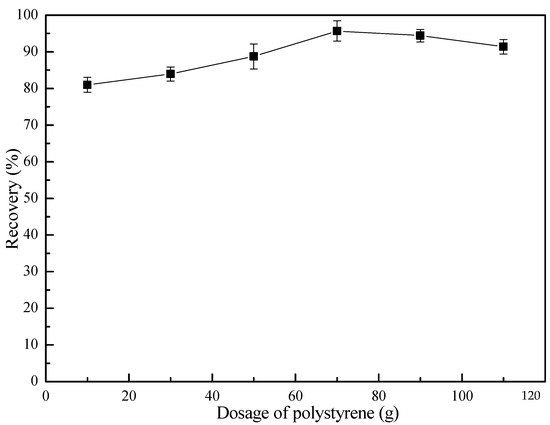 Recovery of smithsonite as a function of polystyrene dosage (8 × 10−4 mol/L NaOL; pH 7.5).