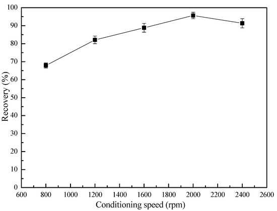 Analogous to bubble–particle interactions, the adhesion between smithsonite and polystyrene can be explained using the probabilities of attachment and detachment. Figure 5 shows smithsonite recovery as a function of stirring intensity. As agitation intensity increased, the system’s energy input was able to overcome the medium resistance raised from particle collision. This energy can also be used to overcome the energy barrier amid smithsonite–polystyrene–bubble interaction. As a result, the hydrophobized fine smithsonite particles interacted with and adhered to the surface of coarse polystyrene particles when the agitation was increased up to 2000 rpm, which led to a high recovery of smithsonite. A further increase in conditioning speed (>2000 rpm) would cause detachment of the adhered ultrafine particles or disrupt the formed smithsonite–polystyrene aggregates due to the high shear forces at the contact surface [34].