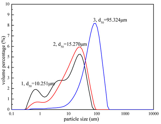 Particle size distribution curves. (1) Raw ore. (2) Concentrate of smithsonite collected with 8 × 10−4 mol/L NaOL. (3) Concentrate of smithsonite collected using 70 kg/t PS and 8 × 10−4 mol/L NaOL.