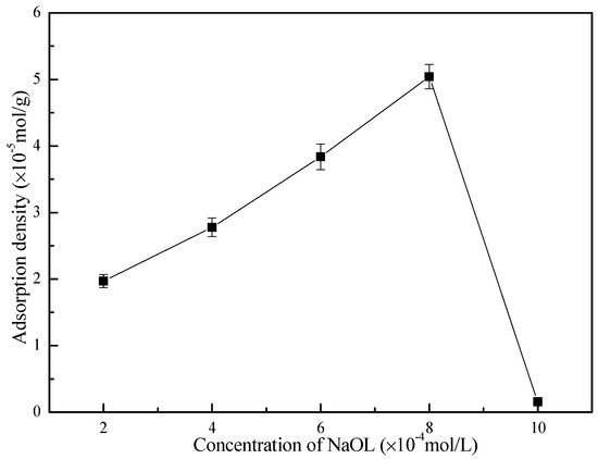 As shown in Figure 2, smithsonite recovery increased as oleate concentration increased (with and without polystyrene), indicating the importance of oleate adsorption on smithsonite. To verify that the improved smithsonite flotation recovery is due to oleate adsorption, the adsorption density of sodium oleate on polystyrene was measured. The results in Figure 7 show that the adsorption density of sodium oleate on the polystyrene surface increased as sodium oleate concentration increased, which reached 8 × 10−4 mol/L sodium oleate before dropping rapidly. The maximum adsorption density of the oleate on polystyrene correlated well with the maximum smithsonite recovery (Figure 2 vs. Figure 7). A further increase in the sodium oleate concentration to higher than 8 × 10−4 mol/L resulted in a drastic reduction in adsorption, which also correlated well with reduced smithsonite recovery at the same oleate concentration (with polystyrene addition). Based on the critical micelle concentration (CMC) of oleate 1.0 × 10−3 mol/L [35], we infer that the formation of micelles led to the sharp decrease in oleate adsorption on polystyrene when the oleate concentration was greater than 8 × 10−4 mol/L.