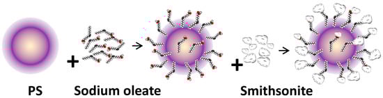 The results of the above experiments suggest a mechanism for the behavior of polystyrene as a carrier. A schematic representation of the flotation process with polystyrene as the carrier is shown in Figure 8. Accordingly, after polystyrene was added to the sodium oleate solution, stirred, and uniformly dispersed, the oleate hydrocarbon tail adhered to the polystyrene surface through hydrophobic association; the polar heads faced water, thus generating a stabilized polystyrene suspension. Subsequently, the prepared solution was poured into a pulp with smithsonite, at which point the smithsonite particles interacted with polystyrene via two possible routes.