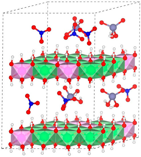 The LDH structures used in this study were based on the powder X-ray diffraction data of hydrotalcite after refinement using the Rietveld method [60]. Part of the magnesium was replaced by aluminum to reach Mg/Al ratios of 2:1, 3:1, and 4:1. The isomorphic substitutions of Al for Mg in the octahedral sheets followed Loewenstein’s rule [51,61] at relatively low layer charge densities (with a Mg/Al ratio of 3:1 or 4:1), that is, no substitution sites were adjacent, while at a Mg/Al ratio of 2:1, there were two neighboring substitution sites because the periodic boundary conditions did not allow all the trivalent cations to satisfy the cation avoidance rule, and some studies [50] have proven that a few adjacent substitution sites will not affect the overall structures and dynamics properties of LDHs. Considering the limits of computational power, we modified the original model with three octahedral sheets to two sheets, which consists of 4 × 4 × 2 M-OH octahedra. Models with a Mg/Al ratio of 2:1, 3:1, and 4:1 contain 5, 4, and 3 substitution sites per sheet, respectively. The net positive charges of octahedral sheets were compensated by the interlayer anions H2AsO4−, HAsO42−, H2AsO3−, and NO3− (Figure 1). The number of As and water molecules was obtained from previous studies [8,46]. The basal spacings of our initial models were increased artificially to incorporate arsenic species. Oxy-anions were separated from each other by water molecules. The compositions of simulated systems are listed in Table 1. Periodic boundary conditions were imposed on the three directions (i.e., XYZ) for all calculations.