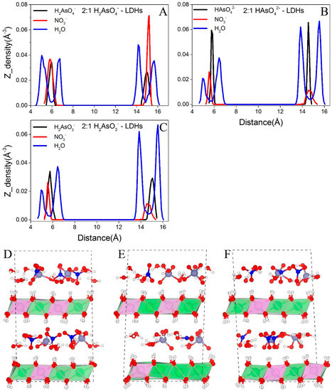 Figure 4 shows the distributions of water molecules and NO3− in NO3−-LDHs systems. At low layer charge density (Mg/Al = 4:1, Figure 4A,D), both water and NO3− exhibit a single layer distribution. At higher layer charge densities (Mg/Al = 3:1 and 2:1), water molecules form double layer distributions and NO3− retains the single layer distribution (Figure 4B,C,E,F).