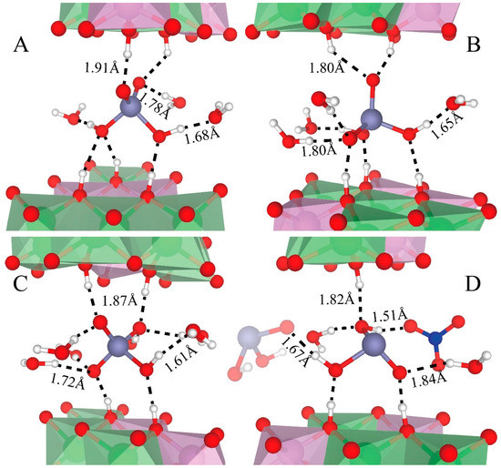 Figure 8 depicts the hydrogen bonds of H2AsO4− (Figure 8A,B), HAsO42− (Figure 8C), and H2AsO3− (Figure 8D). The oxygen of these species can accept two or three hydrogen bonds from water and LDHs-OHs (Figure 8). Their OHs donate one hydrogen bond to water molecules (Figure 8A–C) or NO3− (Figure 8D), but not to LDHs-OHs.