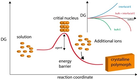 In terms of classical nucleation theory, polymorph formation is a process dictated by thermodynamic and kinetics factors, where monomer-by monomer addition to an isolated ordered cluster results in a crystal with a given lattice structure (Figure 1) [15,16,29,54]. In the classical scheme polymorph selection is thus determined by the correct combination of polymorph-specific thermodynamic (e.g., temperature, pressure, volume) and kinetic (i.e., timeline or rate) factors which lower the nucleation energy barrier to crystal formation [54]. Hypothetically, this process could be managed by agents or additives in many ways to lower the energy barrier for nucleation and generate the appropriately structured cluster that would subsequently grow into a specific polymorph via monomer-by-monomer addition [15,16,29,54]. In laboratory practice, however, there is sometimes a lack of efficiency in generating a desired polymorph by simply manipulating these factors, and this leads to the formation of undesired polymorphs as impurities [20].
