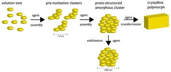 Non-classical nucleation scheme involving pre-nucleation clusters. The formation of pre-nucleation clusters (PNCs) from constituent ions represents the first step towards mineral formation. The PNCs are linear, chain-like ionic polymers (1–3 nm in diameter) that undergo further assembly into amorphous clusters (AC) (~102 nm in diameter). The AC particle can be stabilized indefinitely by agents, or, can proceed through a transformation mechanism (agent-controlled) and form crystalline solids. In the case where different lattice structures of the same given crystalline compound exist (i.e., polymorph), the choice of polymorph may be dictated at the PNC stage and/or by agents controlling the transformation process. Note that each stage of this non-classical process may be under the control of agent(s) (e.g., proteins, polymers, ions, etc.). Note also that certain steps of the non-classical pathway may be thermodynamically reversible. Adapted from references [27,28,29,30,31].