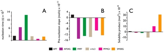 Comparative Ca(II) potentiometric datasets obtained from nacre (AP7, AP24G, Pif97, n16.3, PFMG1) and sea urchin spicule matrix (SM30G) proteins. All datasets are normalized relative to protein-deficient controls and were conducted at pH 9.0. Quantities of protein tested ranged from 500 nM to 1 µM. (A) Nucleation time refers to the time required for PNC formation; (B) “Prenucleation slope” refers to the slope of the linear prenucleation regime in each titration curve. Here, negative value indicates PNC stabilization; positive value indicates PNC destabilization; (C) Solubility product after nucleation. Negative values indicate the presence of less soluble, possibly crystalline phase; positive values reflect transient stabilization of ACC. Data takes from references [58,59,60,61,62,63,64,65,66,67].