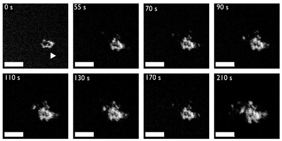An example of protein-mediated mineral nanoparticle attachment: Scanning Transmission Electron Microscopy (STEM) flowcell video stills of mineral nanodeposits forming in 10 mM calcium carbonate solutions in the presence of 13.3 μM Haliotis rufescens abalone shell nacre protein AP7. AP7 is a hydrogelator that forms aggregating gels that contain mineral nanoparticles. The sequence of images starts 45 min after injection of the calcium solution into the protein-containing flow cell (first frame, denoted as 0 s) when mineral nanodeposits are first detected (white arrow, first frame) and nucleation evolves slowly (i.e., 210 s). As one can see, mineral particles are assembling from solution, presumably directed by the protein hydrogel. Note the formation of ring-like nanoclusters as time evolves; this would be atypical for a protein-free assay. By comparison, in the protein-deficient experiments mineralization commences 20 min after injection of the calcium solution and evolves much more rapidly with no evidence of organized particle attachment (data not shown). Scale bars = 100 nm. Taken from reference [62].