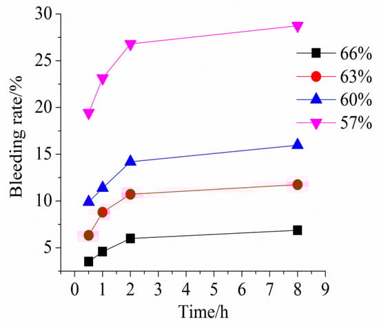 It can be seen from Figure 2 that the bleeding rate is increasing steadily with time, but its increment is decreasing. It reaches a steady state after 8–10 h. Since the bleeding water cannot return to the slurry, it results in the shrinkage of the slurry, which explains why the stope roofs cannot be tightly filled. With a decrease of slurry solids concentration, the bleeding rate increases. When the slurry concentration is reduced from 60% to 57%, the bleeding rate significantly increases from 15.98% to 28.75%. Therefore, in order to keep the slurry self-flowing in the pipe and avoid bleeding, the slurry concentration should not be too low.