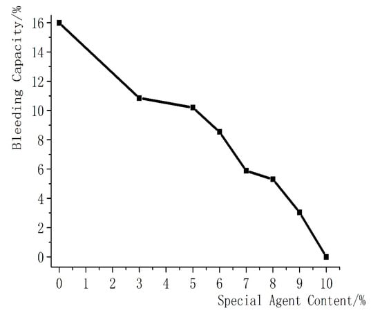 From Figure 3, it is clear that as the dosage of high solidified water additive increases, the 8 h bleeding water loss decreases. When the dosage of special additive accounts for 10% of the binder powder, the bleeding water (15.98% as shown in Figure 2) which would evaporate in the first 30 min, was retained in the filling under the hardened stage.