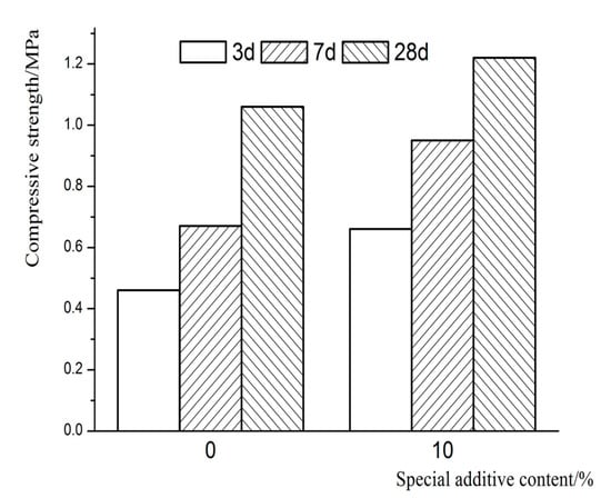 Figure 4 illustrates the unconfined compressive strength of filling slurry with a binder-to-tailings ratio of 1:6 and a solids concentration of 60% at the age of 3, 7, and 28 days. It can be perceived that when the dosage of special additive is 10%, the UCS of filling samples will increase by 43.5%, 41.8%, and 15.1% at 3, 7, and 28 days, respectively, compared with non-additive samples.