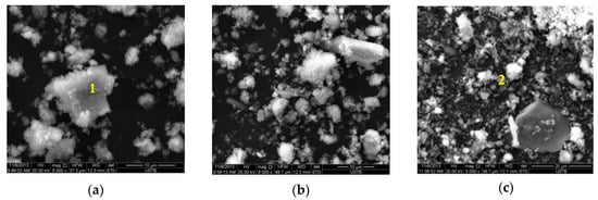 The energy spectrums of slurry from Figure 5a “1” and Figure 5c “2” are given in Figure 6. From Figure 6a, it is found that there are no hydration products generating on the particle surface after 30 min. It is mainly silica, alumina, calcium oxide, and other components of tailings. The four basic elements of ettringite (O, Al, S and Ca) are presented in Figure 6b. It is also revealed that there is a small amount of needle-like ettringite in slurry after 1d hydration.